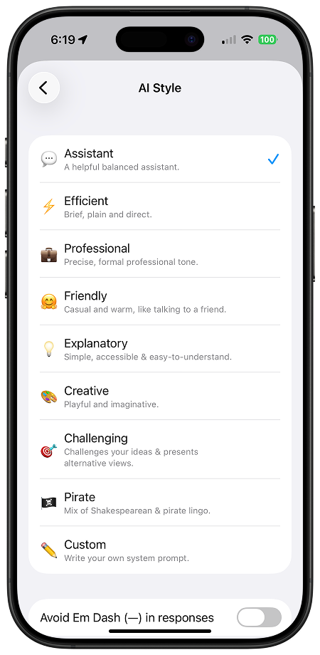 Fello AI also comes with 8 built-in AI styles (Assistant, Efficient, Professional, Friendly, Explanatory, Creative, Challenging, Pirate) if you want a quick preset instead of writing your own. Select Custom to unlock the full system prompt field and write exactly what you need.