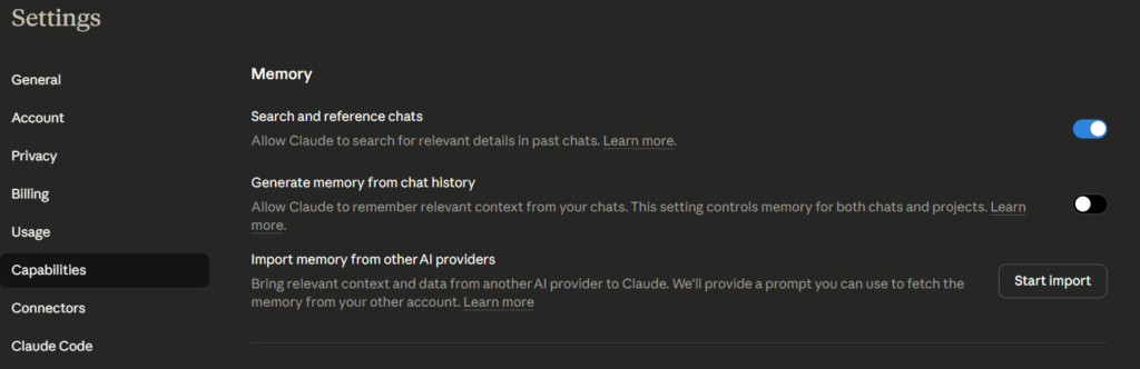 2. In Claude, go to Settings > Capabilities > Import memory from other AI providers.