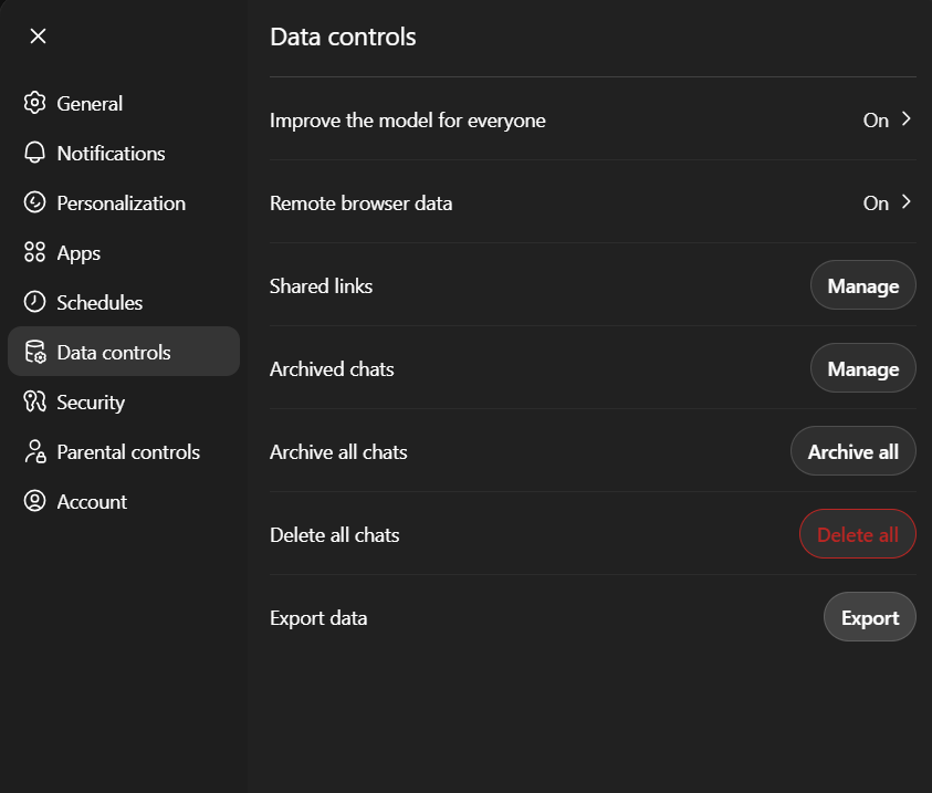 Settings > Data Controls > Export (allow up to 24 hours for delivery) This gives you a full archive of your conversation history, saved memories, and custom instructions in text and JSON format. You don’t need to read through all of it — but having it means you can search for past work and upload relevant context to Claude Projects later.