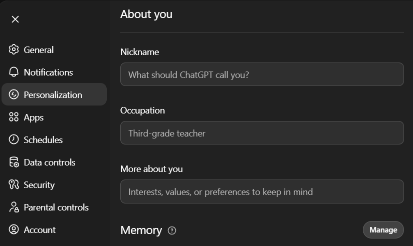 1. Open ChatGPT and navigate to Settings > Personalization > Memory > Manage. Copy the contents.